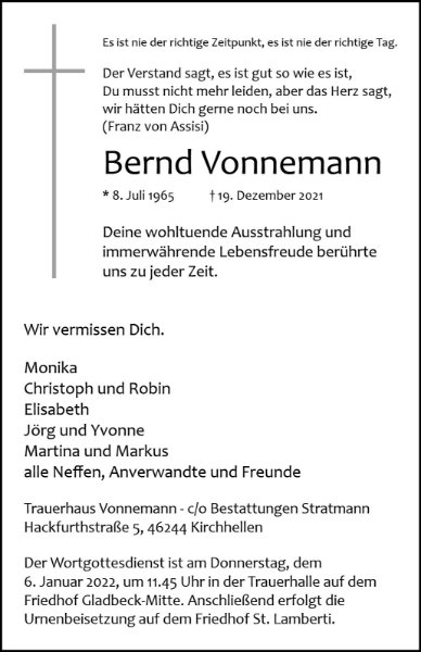 Liebe Monika, ich wünsche Dir, Deinen beiden Söhnen und den Angehörigen von Bernd viel Kraft für die kommenden, schweren Stunden und Tage! Ich denke an Euch und wünsche Euch viele schöne und gemeinsame Erinnerungen an Bernd.