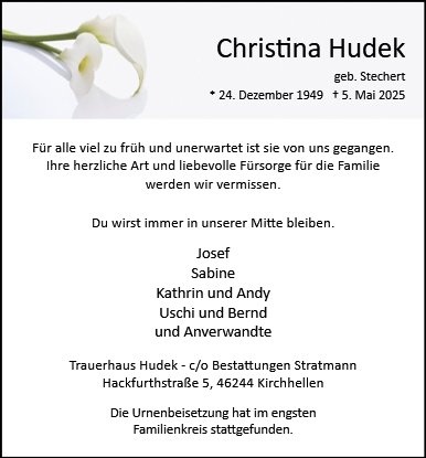 Liebe Christina, wir hatten als Kinder eine wunderschöne Freundschaft. Später zusammen in der Ausbildung bei Hölter gewesen und haben uns bis heute nie aus den Augen verloren. Am 30. April hast Du mich angerufen und wir haben miteinander gelacht. Karell und ich können es nicht fassen, daß Du nicht mehr auf dieser Welt bist. Leider können wir Dich nicht auf Deinem letzten Weg begleiten, da wir z.Zt. in Afrika sind. Du hast in meinem Herzen immer einen festen Platz. Karell und ich wünschen deinem Josef in dieser schweren Zeit ganz viel Kraft.
