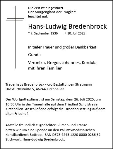 Der ganzen Familie Bredenbrock übersende ich mein tiefempfundenes Beileid aus.