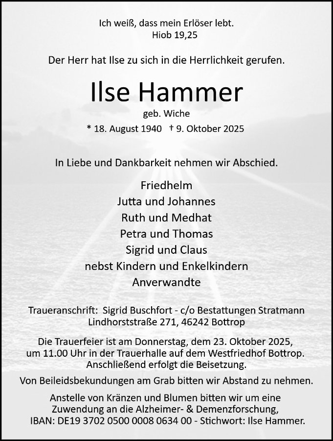 Vielen Dank, das du uns Kindern und Enkelkindern nicht nur den christlichen Glauben gelehrt, sondern auch täglich vor gelebt hast. So dürfen wir ganz sicher wissen, das es ein Leben nach dem Tod gibt und man sich hier auf der Erde zu Jesus Christus, unserem Retter, bekennen muss.