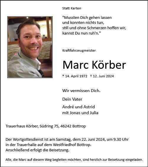Mein Beileid gilt seinem Vater sowie seinem Bruder Andre und Familie. Seine Mutter Iris war meine Cousine. Es tut mir so leid, dass Marc so jung sterben musste.
