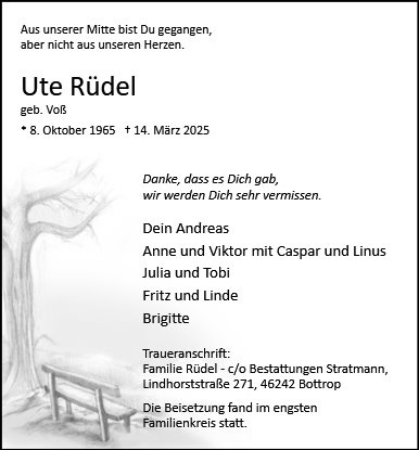 Ich habe gemeinsam mit Ute in St.Hedwig gearbeitet. Ihre stets freundliche Art, ihre Empathie und ihr Verständnis für Bewohner und Kollegen haben sie zu einem wertvollen und wunderbaren Menschen gemacht. Mein tiefes Mitgefühl gilt ihrer Familie. Ich wünsche Ihnen Kraft und Zuversicht in dieser schwierigen Zeit.
